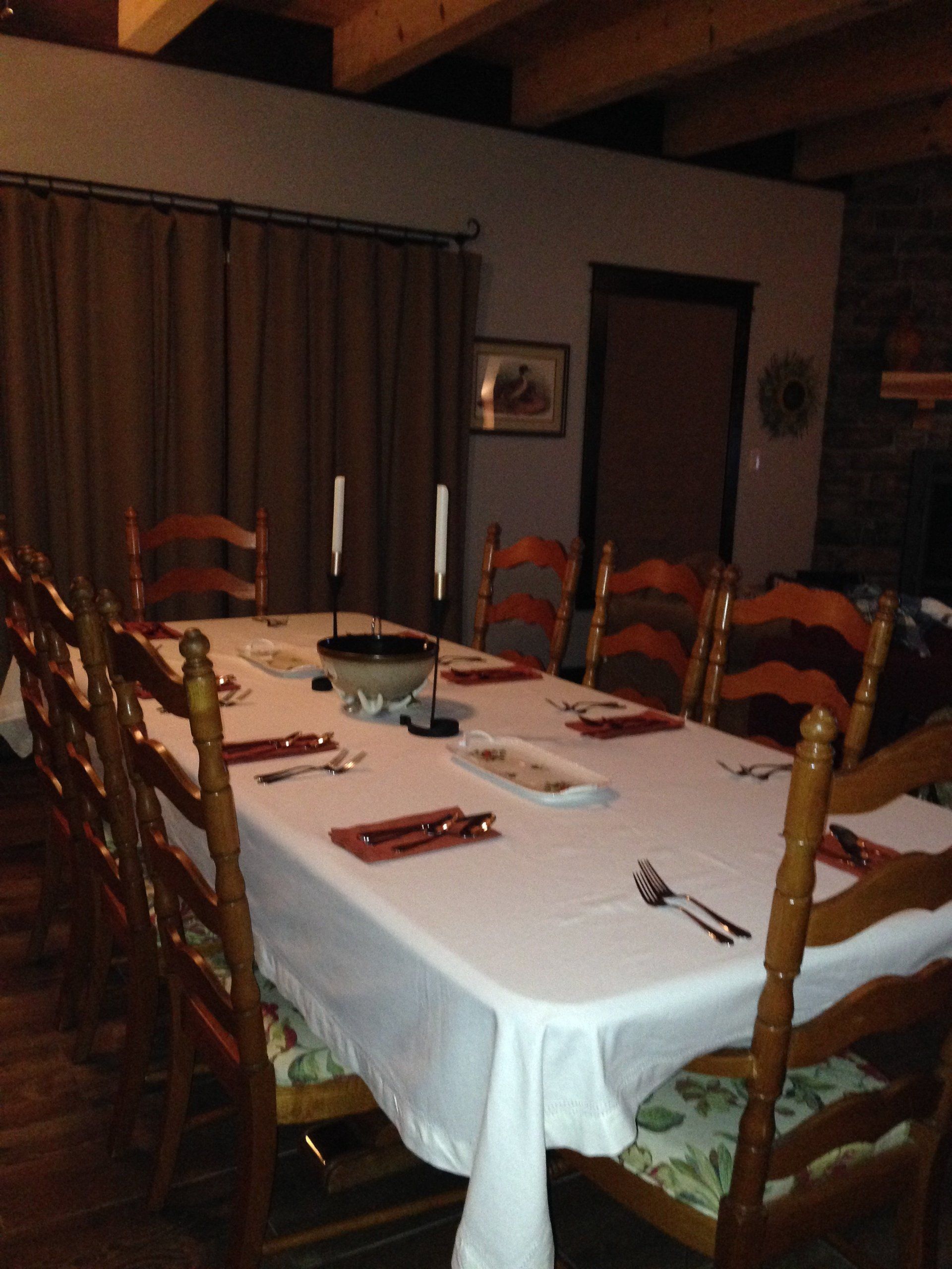 Large dining table adjacent to kitchen and buffet table. Open concept with seating for 8+ at main dining table, 6 at nearby kitchen table, and extra chairs to fit your group.
